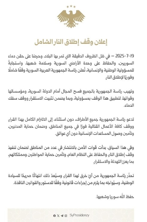 كما أعلنت الرئاسة السورية اليوم وقفاً شاملاً وفورياً لإطلاق النار. وأوضحت أن ذلك يأتي «حرصاً على حقن دماء السوريين، والحفاظ على وحدة الأراضي السورية، واستجابة للمسؤولية الوطنية والإنسانية».