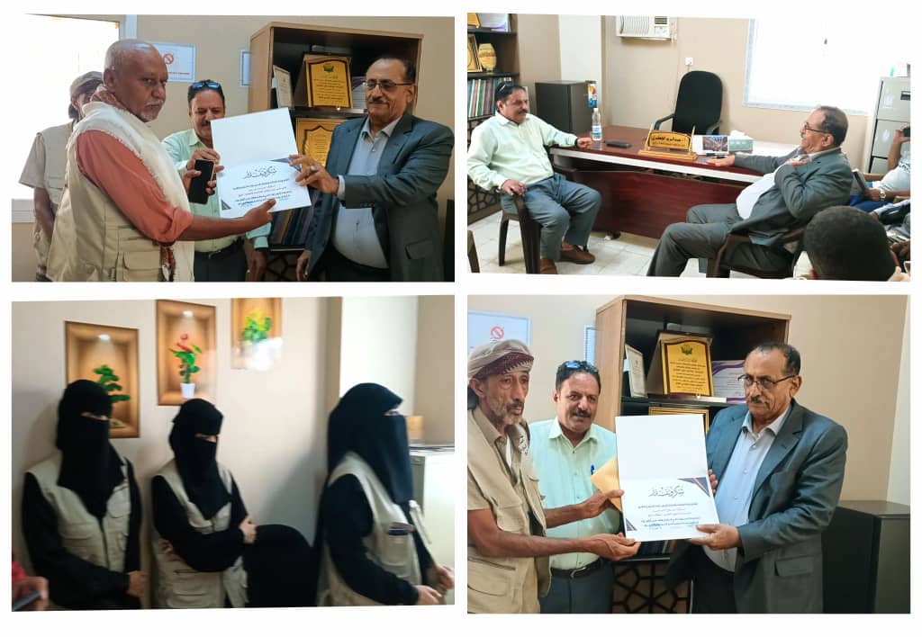 عبده حزام نائب المدير العام للمكتب و الأستاذ/ صلاح الدوخة و ذلك تقديرٱ و عرفانٱ بدورهما الريادي و المتميز الذي لعبوه طيلة أربعة عقود من الزمان و ما قدموه و يقدموه من عطاءات خلاقة و مثمرة أسهمت إسهامٱ فعالٱ و بما لا يدع مجالٱ للشك في تطوير العمل في المكتب و تحسين أدائه ، عن طريق ما بذلوه و يبذلوه من جهود مخلصة و متفانية في تنفيذ المهام الموكلة إليهما بكل صدق و أمانة و شفافية خدمة للمحافظة و مواطنيها