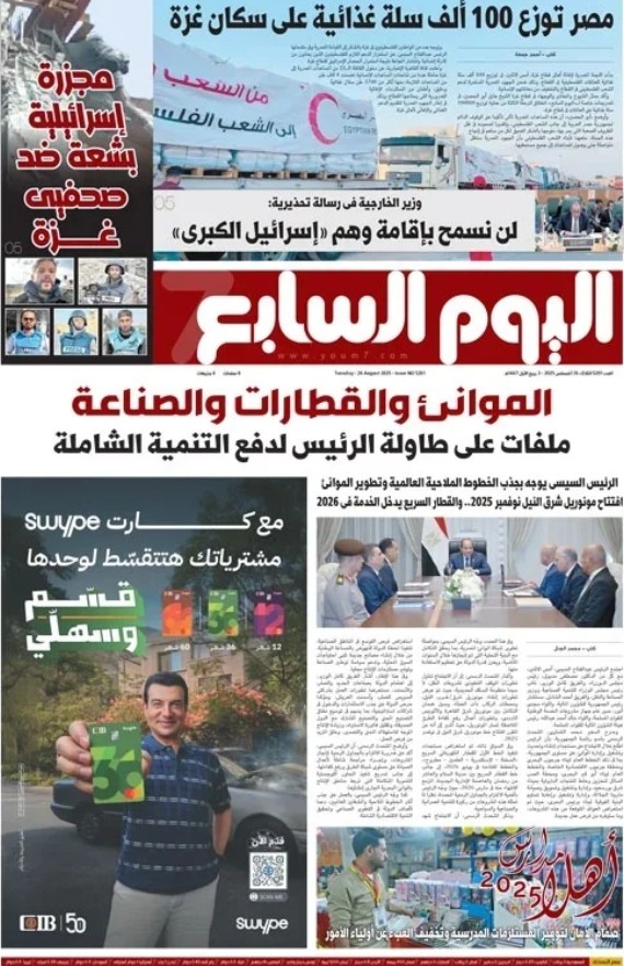 تنشر اليوم السابع فى عددها الصادر اليوم ، تفاصيل هامة حول العديد من الأحداث الجارية على الساحتين الداخلية والخارجية: مصر توزع 100 ألف سلة غذائية على سكان غزة