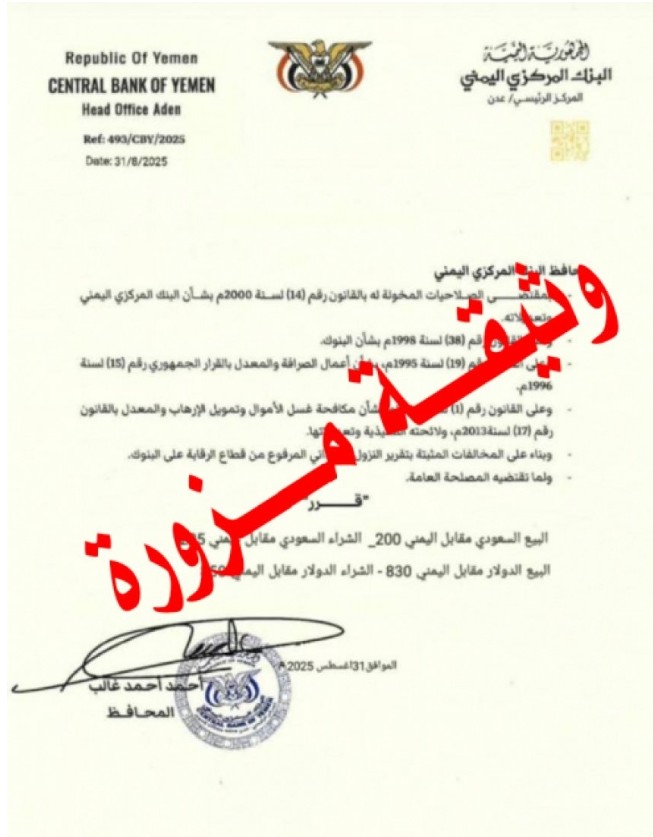 ينوه البنك المركزي اليمني عدن، بأنه لا صحة لخبر صدور تعميم يخص تحديد سعر الصرف للعملات الأجنبيه كما في الصورة المرفقة، وإن هذه الوثيقة مزورة.