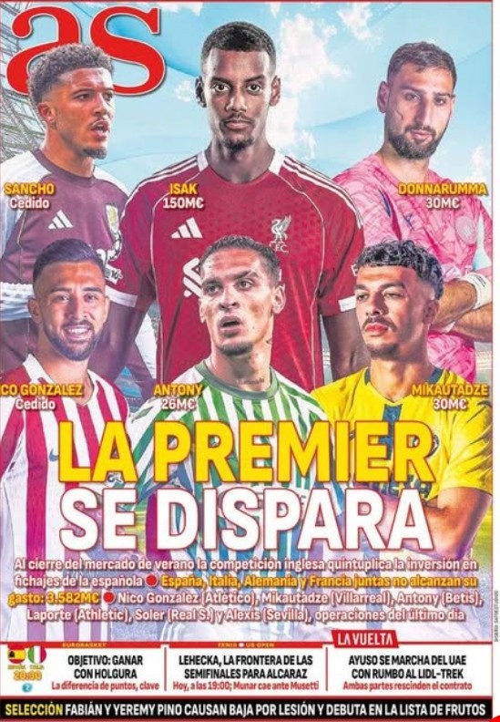 وكتبت صحيفة “آس”الإسبانية، قائله: “الدوري الإنجليزي الممتاز ينفجر. مع نهاية سوق الانتقالات الصيفي، تضاعفت استثمارات الدوري الإنجليزي خمس مرات مقارنة بالدوري الإسباني. حجم الإنفاق الإنجليزي: 3.582 مليار يورو . إسبانيا، إيطاليا، ألمانيا وفرنسا معًا لم تصل لهذا الرقم”.