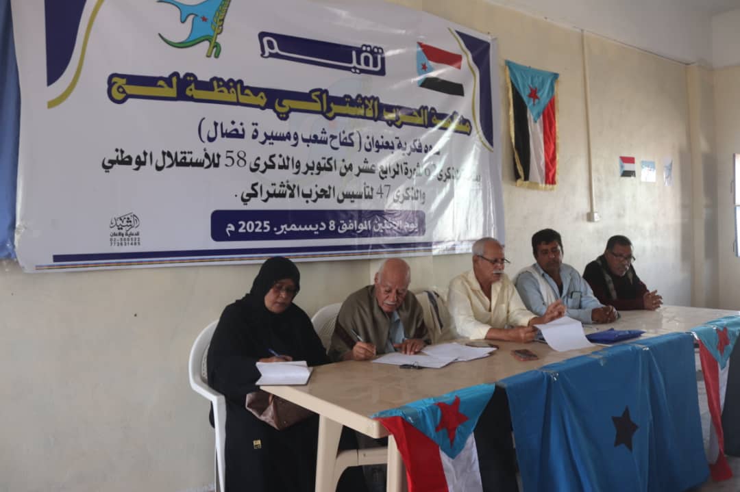 اقامت منظمة الحزب الأشتراكي محافظة لحج هذا اليوم الأثنين الموافق 8 ديسمبر 2025م ندوه فكرية بعنوان (كفاح شعب ومسيرة نضال) بمناسبة الذكرى 62 لثورة الرابع عشر من اكتوبر والذكرى 58 للأستقلال الوطني والذكرى 47 لتأسيس الحزب الأشتراكي.