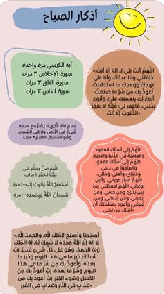 (أَصْـبَحْنا وَأَصْـبَحَ المُـلْكُ لله وَالحَمدُ لله، لا إلهَ إلاّ اللّهُ وَحدَهُ لا شَريكَ لهُ، لهُ المُـلكُ ولهُ الحَمْـد، وهُوَ على كلّ شَيءٍ قدير، رَبِّ أسْـأَلُـكَ خَـيرَ ما في هـذا اليوم وَخَـيرَ ما بَعْـدَه، وَأَعـوذُ بِكَ مِنْ شَـرِّ ما في هـذا اليوم وَشَرِّ ما بَعْـدَه، رَبِّ أَعـوذُ بِكَ مِنَ الْكَسَـلِ وَسـوءِ الْكِـبَر، رَبِّ أَعـوذُ بِكَ مِنْ عَـذابٍ في النّـارِ وَعَـذابٍ في القَـبْر).