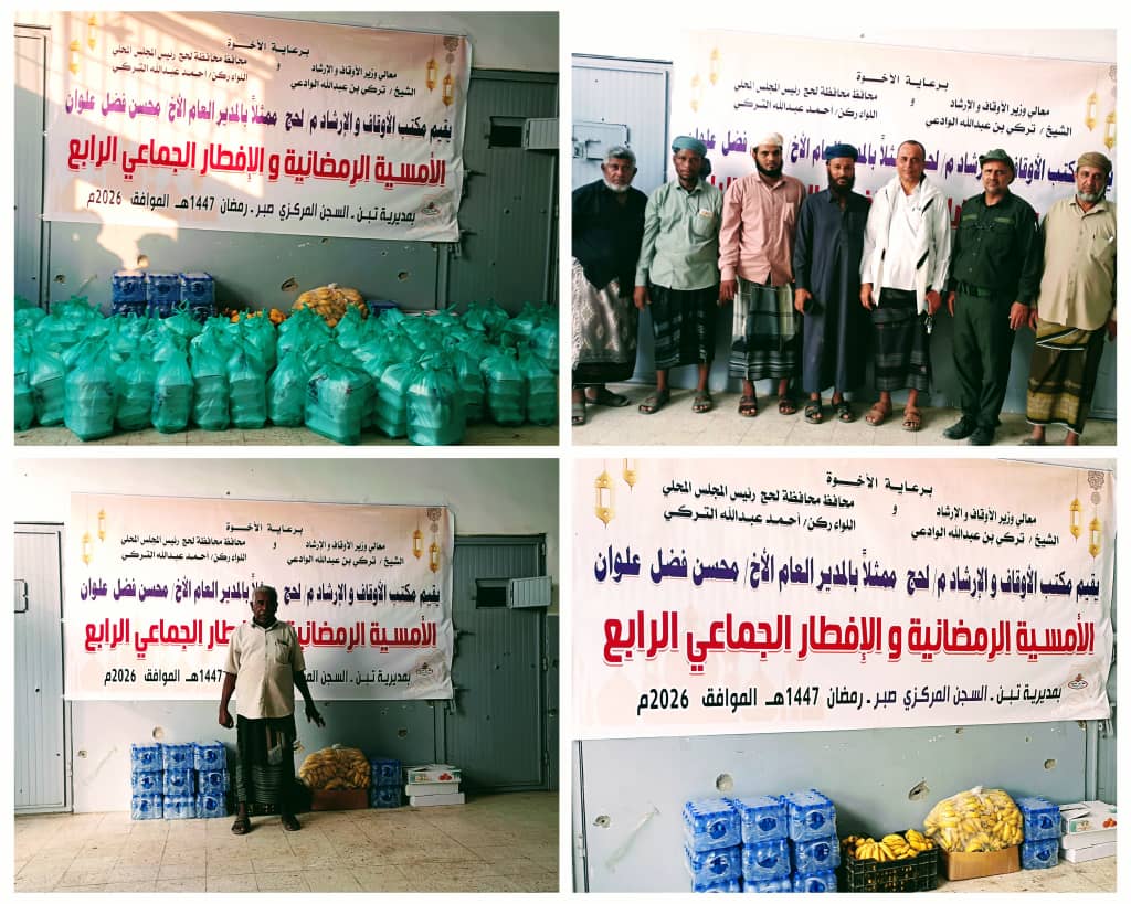 في إطار الجهود المستمرة لنشر الوعي الإرشادي و التوعوي في المجتمع و برعاية كريمة من معالي وزير الأوقاف و الإرشاد الشيخ تركي بن عبد الله الوادعي و محافظ محافظة لحج اللواء الركن أحمد عبد الله تركي ، دشن مكتب الأوقاف والإرشاد بمحافظة لحج، ممثلاً بالمدير العام للمكتب الأستاذ محسن بن فضل علوان الشعبي، فعالياته التوعوية الإرشادية و مآدب الإفطار و العشاء الجماعي في إصلاحية السجن المركزي .