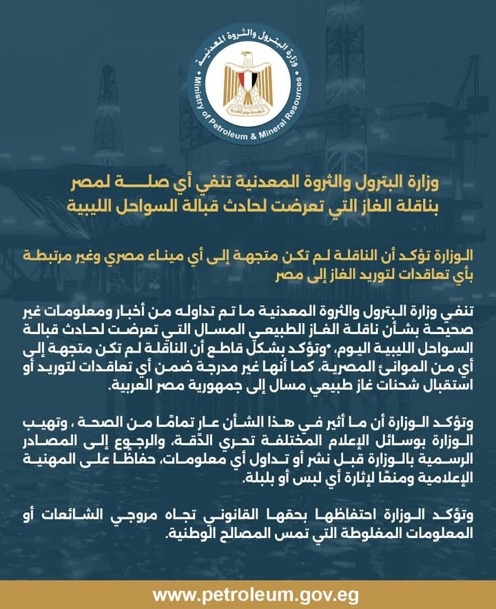 تنفي وزارة البترول والثروة المعدنية ما تم تداوله من أخبار ومعلومات غير صحيحة بشأن ناقلة الغاز الطبيعي المسال التي تعرضت لحادث قبالة السواحل الليبية اليوم، *وتؤكد بشكل قاطع أن الناقلة لم تكن متجهة إلى أي من الموانئ المصرية، كما أنها غير مدرجة ضمن أي تعاقدات لتوريد أو استقبال شحنات غاز طبيعي* مسال إلى جمهورية مصر العربية.