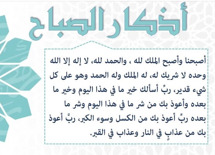 أذكار الملك: “أصبحنا وأصبح الملك لله، والحمد لله، لا إله إلا الله وحده لا شريك له، له الملك وله الحمد وهو على كل شيء قدير، رب أسألك خير ما في هذا اليوم وخير ما بعده، وأعوذ بك من شر ما في هذا اليوم وشر ما بعده، رب أعوذ بك من الكسل وسوء الكبر، رب أعوذ بك من عذاب في النار وعذاب في القبر” (مرة واحدة).