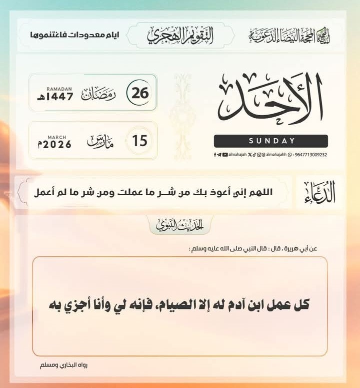 قال رسول اللَّه ﷺ : ” كُلُّ عَمَلِ ابْنِ آدَمَ يُضَاعَفُ، الحَسَنَةُ عَشْرُ أَمْثَالِهَا، إلى سَبْع مِائَة ضِعْفٍ، قالَ اللَّهُ عَزَّ وَجَلَّ: إلَّا الصَّوْمَ؛ فإنَّه لي، وَأَنَا أَجْزِي به، يَدَعُ شَهْوَتَهُ وَطَعَامَهُ مِن أَجْلِي. لِلصَّائِمِ فَرْحَتَانِ: فَرْحَةٌ عِنْدَ فِطْرِهِ، وَفَرْحَةٌ عِنْدَ لِقَاءِ رَبِّهِ. وَلَخُلُوفُ فيه أَطْيَبُ عِنْدَ اللهِ مِن رِيحِ المِسْكِ ” .