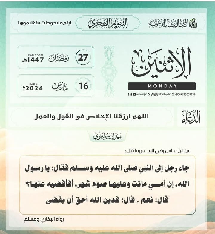 الإثنين 27 #رمضان 1447 هـ .