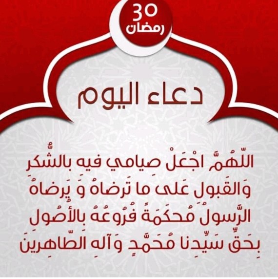 دعاء اليوم الثلاثين من شهر رمضان مكتوب “عن ابن عَبَّاسٍ، عَنِ النَّبِيِّ صلى الله عليه وآله:” اللَّهُمَّ اجْعَلْ صِيَامِي فِيهِ بِالشُّكْرِ وَ الْقَبُولِ عَلَى مَا تَرْضَاهُ وَ يَرْضَاهُ الرَّسُولُ، مُحْكَمَةً فُرُوعُهُ بِالْأُصُولِ، بِحَقِّ مُحَمَّدٍ وَ آلِهِ الطَّيِّبِينَ الطَّاهِرِينَ “.