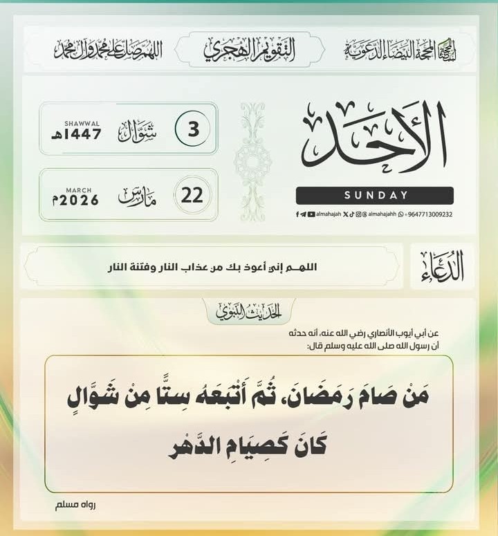 قال رَسُولُ اللهِ ﷺ : ” من صام رمضانَ وأتبعَهُ بستٍّ من شوالَ فكأنما صام الدهرَ ” .