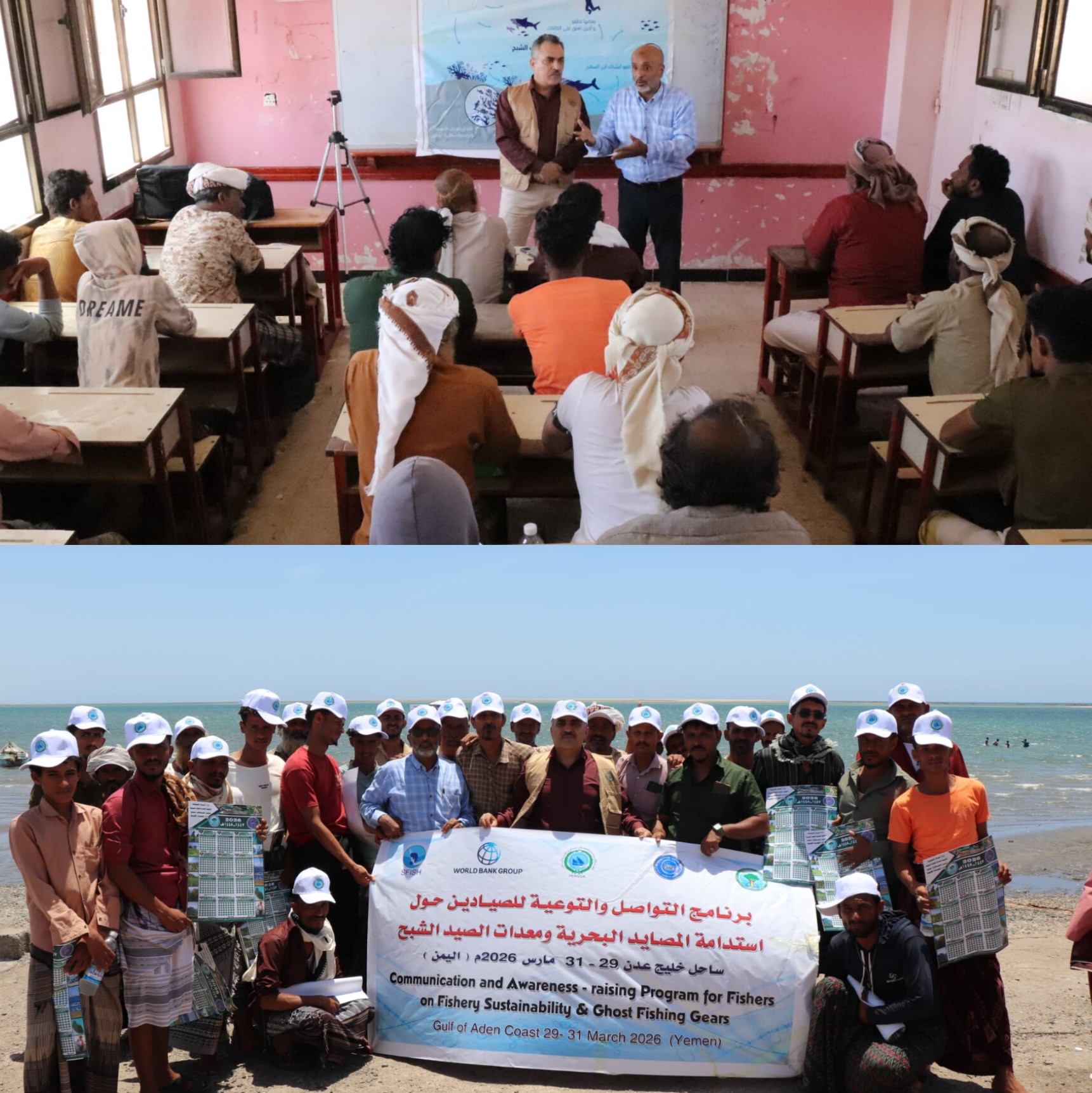 نظمت الهيئة الاقليمية للمحافظة على بيية البحر الاحمر وخليج عدن (PERSGA) حملة توعية برنامج التواصل لعدد 35 صيدا في محمية خور عميرة محافظة لحج حول استدامة المصائد البحرية ومعدات الصيد الشبح