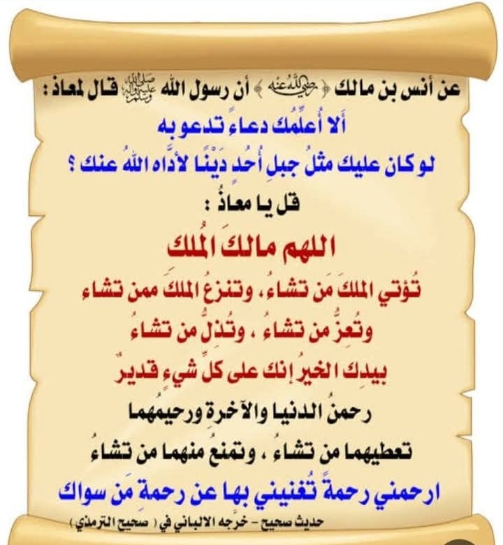 “اللَّهُمَّ مَالِكَ الْمُلْكِ تُؤْتِي الْمُلْكَ مَنْ تَشَاءُ، وَتَنْزِعُ الْمُلْكَ مِمَّنْ تَشَاءُ، وَتُعِزُّ مَنْ تَشَاءُ، وَتُذِلُّ مَنْ تَشَاءُ، بِيَدِكَ الْخَيْرُ، إِنَّكَ عَلَى كُلِّ شَيْءٍ قَدِيرٌ. رَحْمَنَ الدُّنْيَا وَالْآخِرَةِ وَرَحِيمَهُمَا، تُعْطِيهُمَا مَنْ تَشَاءُ، وَتَمْنَعُ مِنْهُمَا مَنْ تَشَاءُ، ارْحَمْنِي رَحْمَةً تُغْنِينِي بِهَا عَنْ رَحْمَةِ مَنْ سِوَاكَ”.