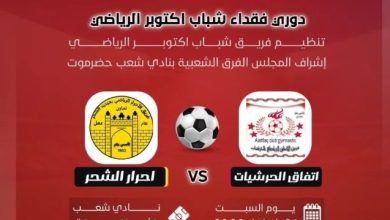 المكلا/ دار العرائس الجمعة 4 شعبان 1447ه الموافق 23 يناير 2026م تنطلق عصر السبت على ملعب كرة القدم بمنشاة نادي…