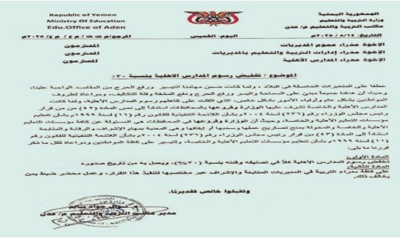 مكتب التربية والتعليم بعدن يعلن تخفيض 30%من رسوم المدارس الأهلية