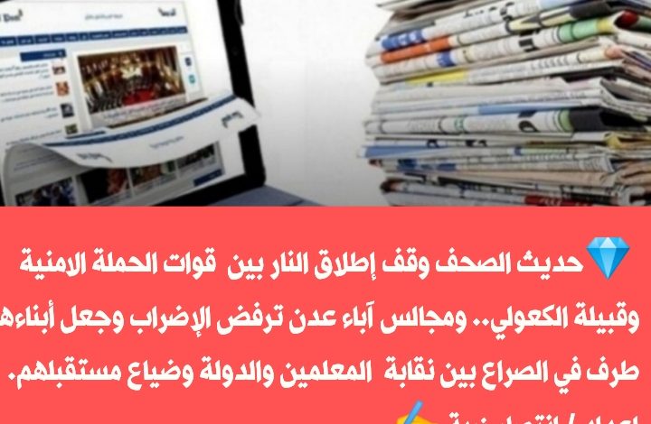 💎حديث الصحف : وقف إطلاق النار بين قوات الحملة الامنية وقبيلة الكعولي.. ومجالس آباء عدن ترفض الإضراب وجعل أبناءها طرف في الصراع بين نقابة المعلمين والدولة وضياع مستقبلهم.