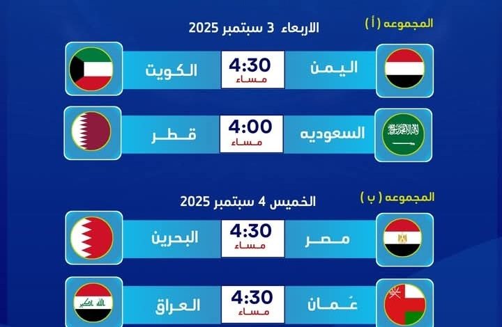 تُقام مباراة السعودية وقطر في تمام الساعة الثامنة والنصف مساءً بتوقيت القاهرة، وفي نفس البطولة، يلتقي منتخبا الكويت واليمن في تمام الساعة الرابعة والنصف عصرًا بتوقيت القاهرة.